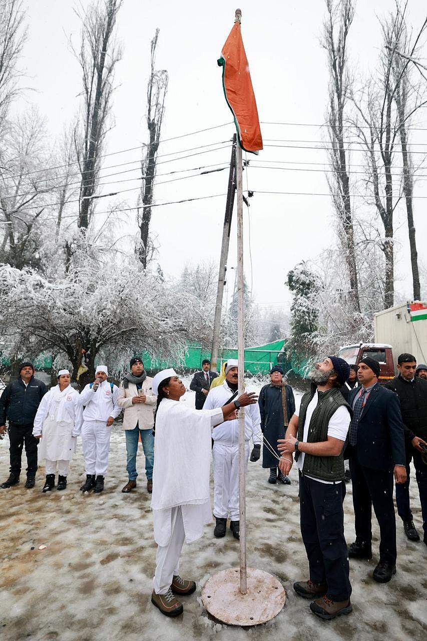பனிமழைக்கு இடையே.. நடைப்பயண முகாமில் தேசியக் கொடியேற்றினார் ராகுல் காந்தி