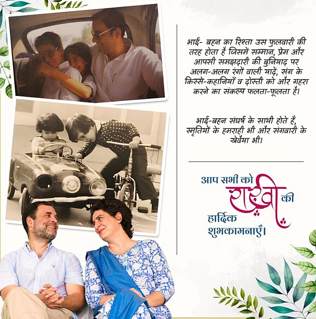 ரக்ஷா பந்தன் பண்டிகையையொட்டி ராகுல் காந்தி, பிரியங்கா காந்தியும் சமூக வலைத்தளத்தில் தனது வாழ்த்துகளைப் பகிர்ந்துள்ளனர்.