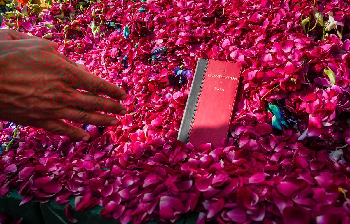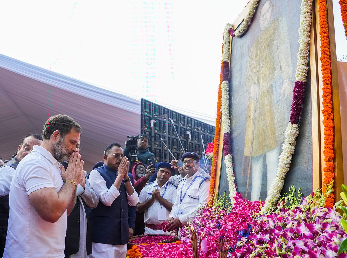 அப்போது ராகுல் காந்தி அம்பேத்கரின் உருவப் படத்திற்கு கீழே அரசமைப்புப் புத்தகத்தை வைத்து வணங்கினார்.