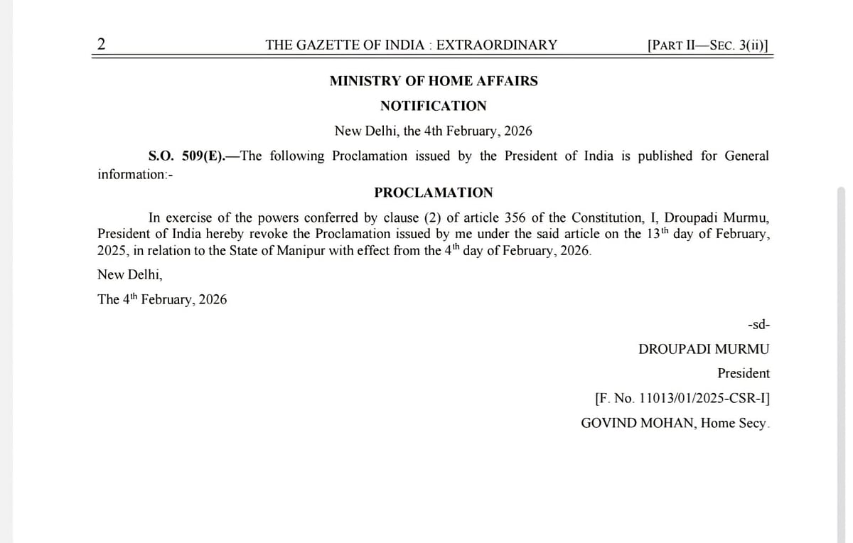 மணிப்பூரில் குடியரசுத்தலைவர் ஆட்சி வாபஸ் பெறப்படுவதாக மத்திய உள்துறை அமைச்சகம் இன்று(பிப். 4) அறிவிப்பு வெளியிட்டுள்ளது.