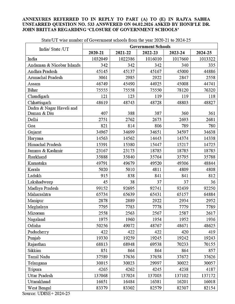 அதில், நாடு முழுவதும் கடந்த 2020 - 21 ஆம் ஆண்டில் 10,32,049 ஆக இருந்த அரசுப் பள்ளிகளின் எண்ணிக்கை 2024 - 25 ஆம் ஆண்டில் 10,13,322 ஆகக் குறைந்துள்ளதாக தெரிவிக்கப்பட்டுள்ளது. கடந்த 5 ஆண்டுகளில் மட்டும் 18,727 அரசுப் பள்ளிகள் மூடப்பட்டுள்ளதாக தெரிவிக்கப்பட்டுள்ளது.
