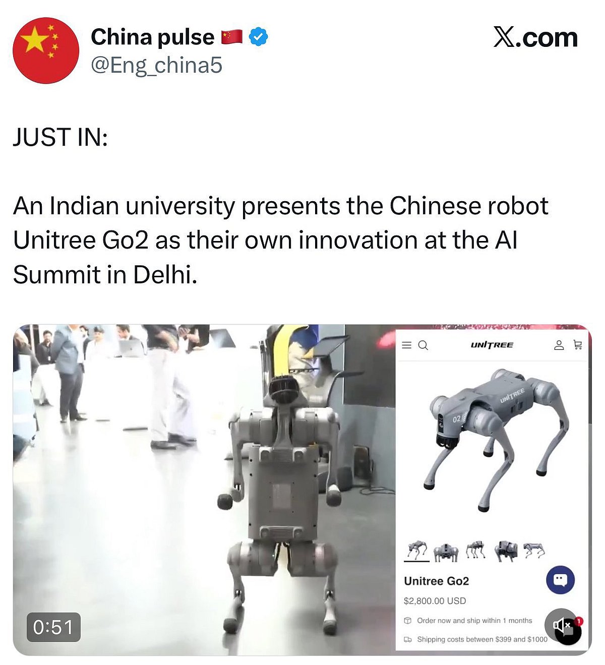 இந்த குளறுபடிகளுக்கு மத்தியில், புதிய பிரச்சினையாக உத்தரப் பிரதேசத்தைச் சேர்ந்த கல்கோடியாஸ் பல்கலைக்கழக மாணவர்கள், ஆன்லைனில் விற்பனை செய்யப்படும் ரூ. 2 லட்சம் முதல் 3 லட்சம் மதிப்பிலான சீனாவில் தயாரிக்கப்பட்ட யுனிட்ரீ கோ2 என்ற ரோபோ நாயை தாங்கள் தயாரித்ததாகக் கூறி ஏஐ மாநாட்டில் காட்சிப்படுத்தியது பெரும் பரபரப்பை ஏற்படுத்தி கடும் விமர்சனங்களையும் பெற்றுள்ளது.