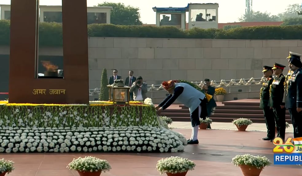 குடியரசு நாளையொட்டி தேசிய போர் நினைவிடத்தில் பிரதமர் நரேந்திர மோடி திங்கள்கிழமை மரியாதை செலுத்தினார்.