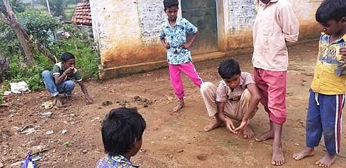 பள்ளிகள் விடுமுறை விடப்பட்ட நிலையில் கோலி குண்டு விளையாடும் மலை கிராம பழங்குடியினக் குழந்தைகள்.
