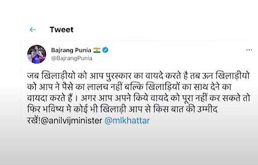 டோக்கியோ ஒலிம்பிக் போட்டியில் வெண்கலப் பதக்கம் வென்ற மல்யுத்த வீரர் பஜ்ரங் புனியா, இதுகுறித்து 2019ஆம் ஆண்டு ட்வீட் ஒன்று வெளியிட்டார். அதில், இதுபோன்ற வாக்குறுதிகளை அளித்தால் அரசு அதனை நிறைவேற்ற வேண்டும் அல்லது இப்படிப்பட்ட வாக்குறுதிகளையே அளிக்கக் கூடாது என்றும் பதிவிட்டுள்ளார்.