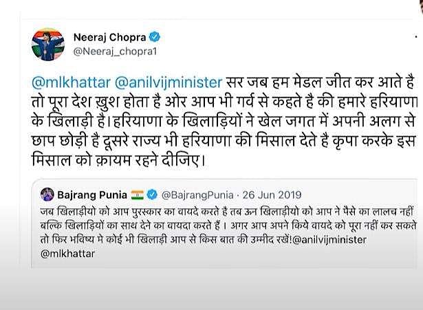 பஜ்ரங் புனியாவின் இப்பதிவை ரீட்வீட் செய்த நீரஜ் சோப்ரா, அரசு தாங்கள் அளித்த வாக்குறுதிகளை நிறைவேற்ற வேண்டும் என்றும் அப்போதுதான் வீரர்களால் விளையாட்டில் கவனம் செலுத்த முடியும் என்றும் தெரிவித்தார். ஒலிம்பிக் வரலாற்றிலேயே அதிக பதக்கங்கள் வென்றதை இந்தியா கொண்டாடிவரும் அதேசமயத்தில், உதவிகள் வேண்டிப் பல விளையாட்டு வீரர்கள் காத்துக் கிடக்கின்றனர்.