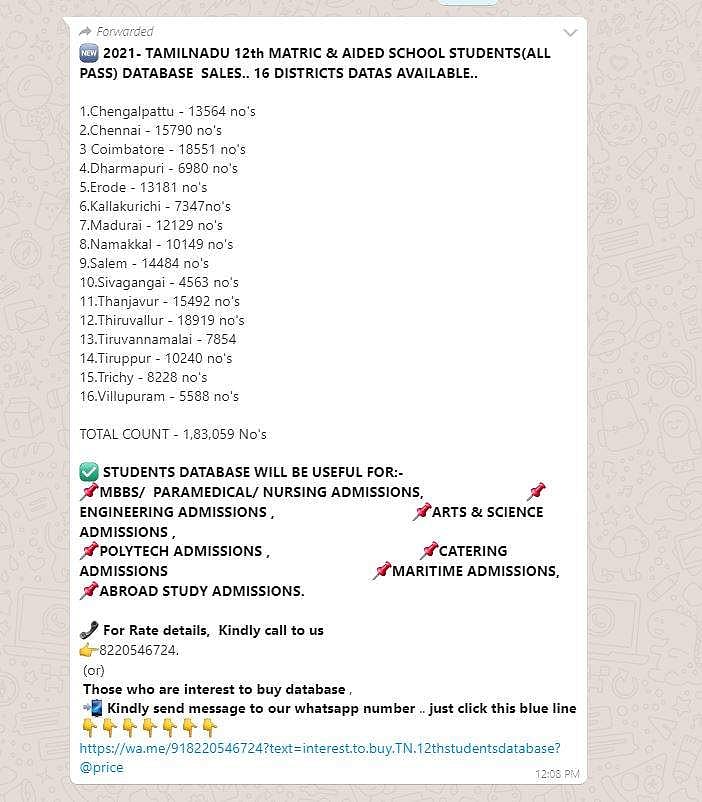 இந்த வாட்ஸ்ஆப் தகவலில், 2021 - தமிழ்நாடு 12 ஆம் வகுப்பு மெட்ரிக் மற்றும் உதவிபெறும் பள்ளிகளின் மாணவ, மாணவியர் (அனைவரும் தேர்ச்சி) பற்றிய தகவல்கள் விற்பனைக்கு... 16 மாவட்டங்களின் தகவல்கள் கிடைக்கும்... எனக் குறிப்பிட்டு,