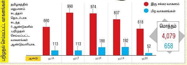 45,000 லிட்டா் கள்ளச்சாராயம்: திருவண்ணாமலை, விழுப்புரம், கடலூா், ராணிப்பேட்டை, செங்கல்பட்டு, கள்ளக்குறிச்சி ஆகிய மாவட்டங்களில் கள்ளச்சாராயம் காய்ச்சும் சம்பவங்கள் அதிகரித்து வருவதைத் தடுக்கும் வகையில், காவல் துறையினா் அங்கு தீவிர கண்காணிப்பில் ஈடுபட்டு கடந்த 20 நாள்களில் 45,405 லிட்டா் கள்ளச்சாராயம் பறிமுதல் செய்யப்பட்டுள்ளது. கள்ளச்சாராயத்தை கட்டுக்குள் கொண்டு வரும் காவல் துறைக்கு, ஆந்திரம், கா்நாடக மாநிலங்களில் இருந்து கடத்தப்படும் மது பானங்களைக் கட்டுப்படுத்துவதை தடுப்பது சாத்தியமற்றதாக மாறியுள்ளது.