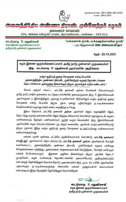 இந்த நிலையில் அக்டோபர் 22 ஆம் தேதி, வழக்கத்துக்கு மாறாக, அதிமுக சார்பில், கழக இணை ஒருங்கிணைப்பாளர் எடப்பாடி கே. பழனிசாமி மட்டுமே கையெழுத்திட்ட கண்டன அறிக்கை வெளியிடப்பட்டது.