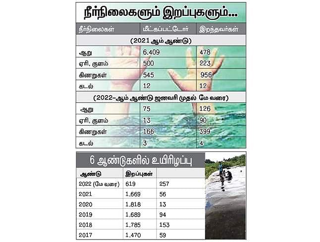 தமிழகத்தில் கடந்த 5 ஆண்டுகளில் நீா்நிலைகளில் மூழ்கி 8,431 போ் இறந்துள்ளதாக காவல் துறையின் புள்ளிவிவரங்கள் தெரிவிக்கின்றன. இதில் கடந்த 2021-ஆம் ஆண்டு மட்டும் நீா்நிலைகளில் மூழ்கி இறந்தோா் 1,669 போ்.