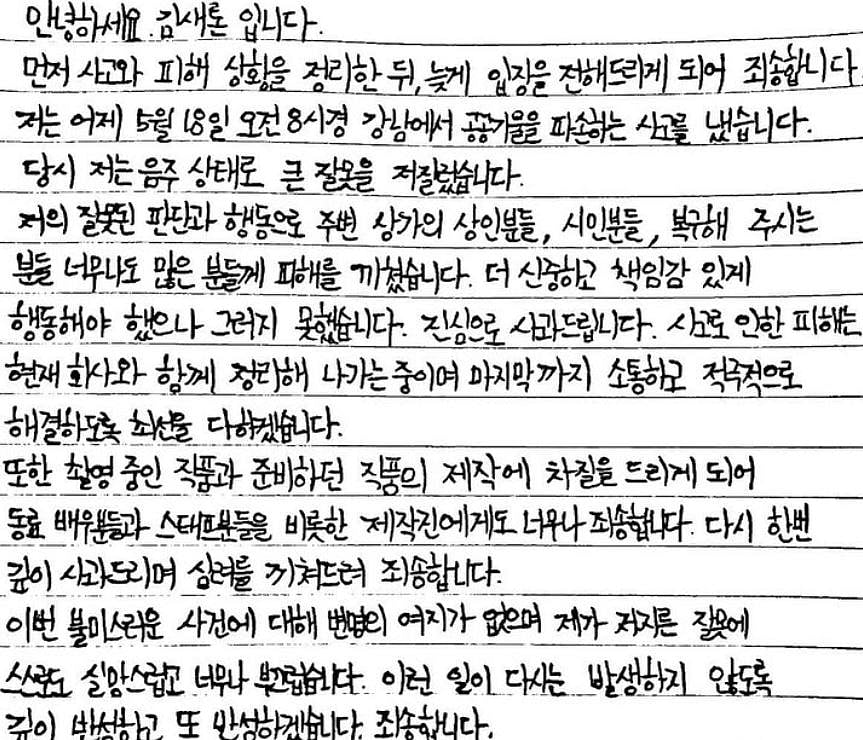 இந்த விரும்பத்தகாத சம்பவத்திற்கு மன்னிப்பு மட்டும் இல்லை, நான் செய்த தவறுக்காக நான் ஏமாற்றமும் வெட்கமும் அடைகிறேன். நான் ஆழ்ந்து சிந்தித்து, மீண்டும் இதுபோன்று நடக்காமல் இருக்க மீண்டும் சிந்திப்பேன். மன்னிக்கவும் (கொரிய மொழியிலிருந்து கூகுள் உதவியுடனான பெயர்ப்பு).