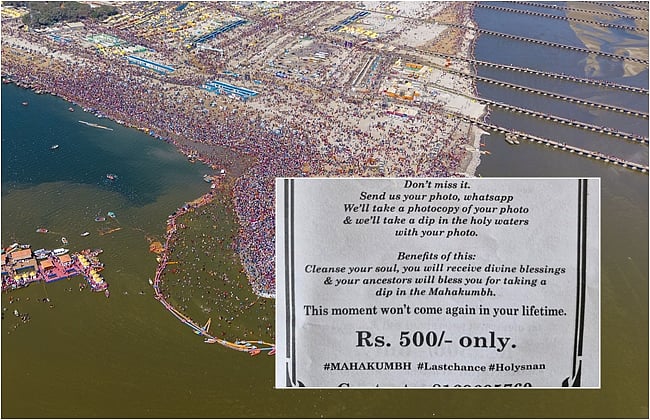 மகா கும்பமேளாவில் புனித நீராட நேரில் வர முடியாத பலர் தங்கள் குடும்பத்தாருக்கு விடியோ அழைப்புகள் மூலம் அந்த இடத்தை விவரித்த சம்பவங்கள் நடந்தன. நேரில் வர முடியவில்லை என அவர்கள் வருந்தினார்களோ என்னவோ? அவர்களின் இயலாமையை முதலீடாக மாற்றிக்கொண்டார் ஒருவர்.