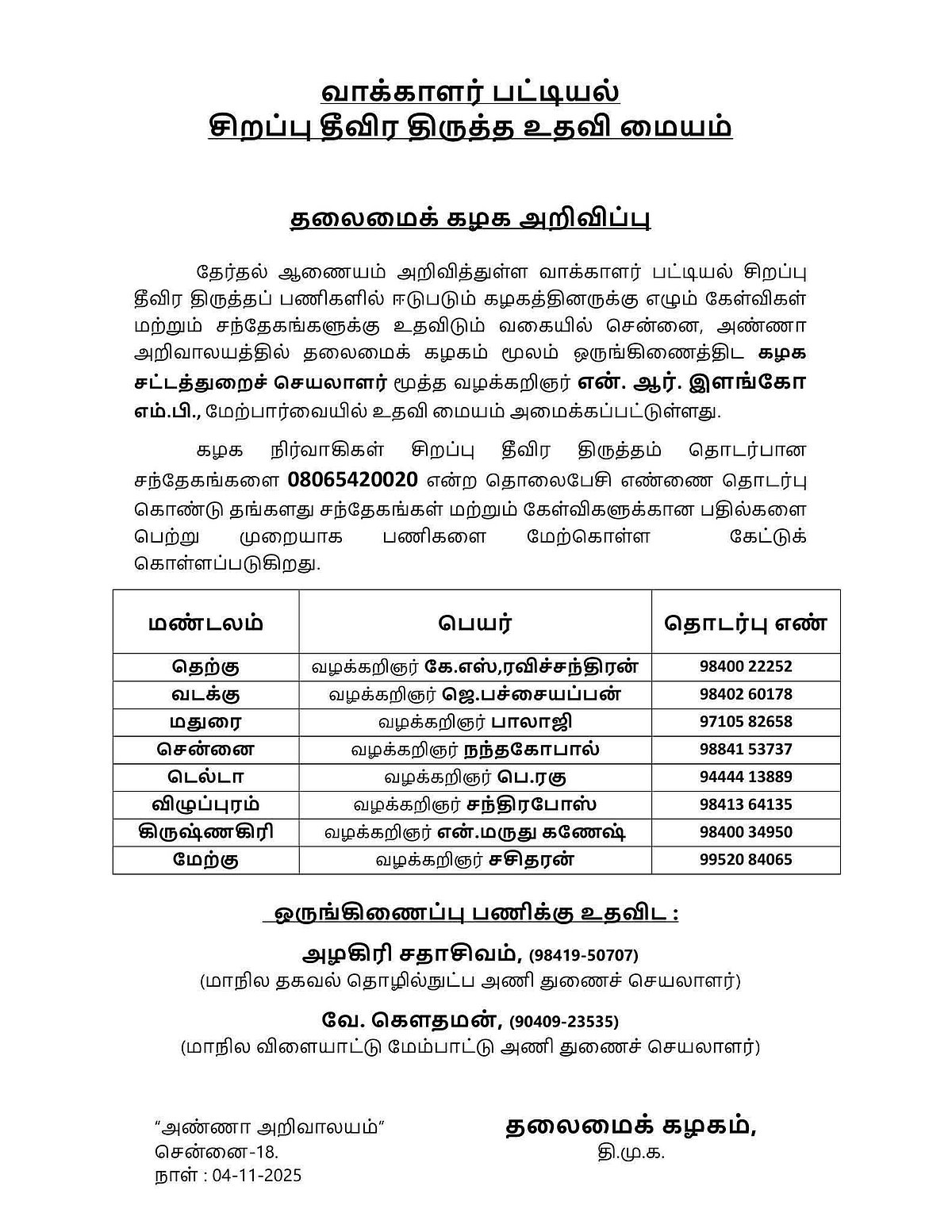 திமுக நிர்வாகிகள் சிறப்பு தீவிர திருத்தம் தொடர்பான சந்தேகங்களை 080654 20020 என்ற தொலைபேசி எண்ணை தொடர்பு கொண்டு தங்களது சந்தேகங்கள் மற்றும் கேள்விகளுக்கான பதில்களை பெறலாம்.