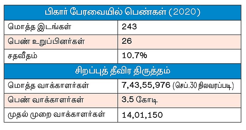 அண்மையில் பிகார் தேர்தலையொட்டி சிறப்புத் தீவிர திருத்தம் (எஸ்ஐஆர்) செய்யப்பட்ட வாக்காளர் பட்டியலை இந்திய தேர்தல் ஆணையம் வெளியிட்டது. அந்தத் தரவு, பெண் வாக்காளர்களின் எண்ணிக்கையில் குறிப்பிடத்தக்க சரிவைக் காட்டுகிறது.