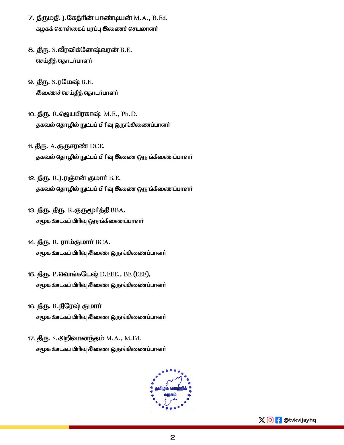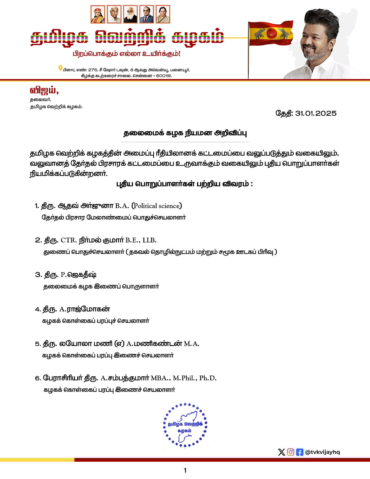 தமிழக வெற்றிக் கழகத்தின் அமைப்பு ரீதியிலானக் கட்டமைப்பை வலுப்படுத்தும் வகையிலும், வலுவானத் தேர்தல் பிரசாரக் கட்டமைப்பை உருவாக்கும் வகையிலும் புதிய பொறுப்பாளர்கள் நியமிக்கப்பட்டுள்ளனர்.