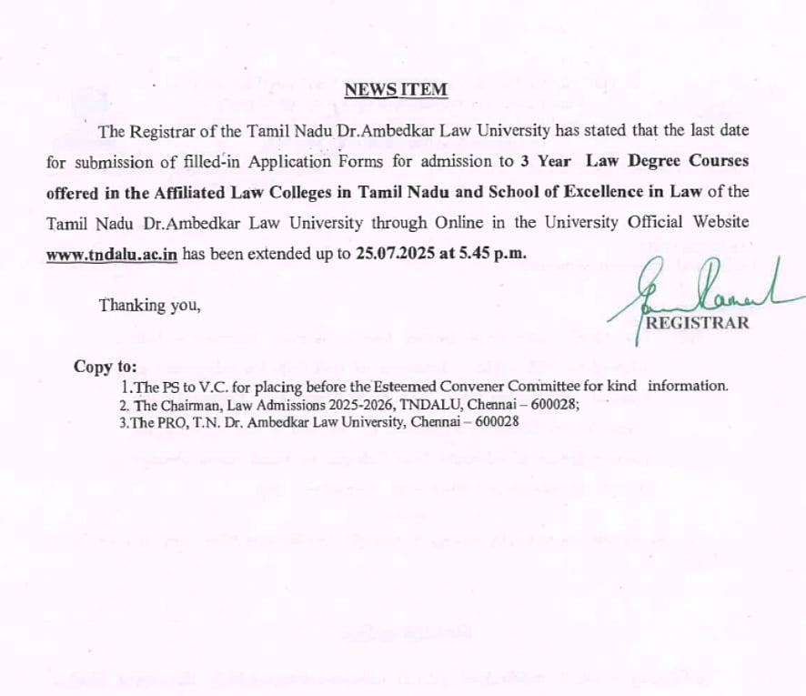 தமிழ்நாடு டாக்டர் அம்பேத்கர் சட்டப் பல்கலைக்கழகத்தின் இணைவு பெற்ற அனைத்து சட்டக்கல்லூரிகள் மற்றும் பல்கலைக்கழகத்தின் கீழ் இயங்கிவரும் சீர்மிகு சட்டப்பள்ளி ஆகியவற்றில் பயிற்றுவிக்கப்படும் மூன்றாண்டு எல்.எல்.பி, மூன்றாண்டு எல்எல்பி(ஹானர்ஸ்) சட்டப்படிப்பிற்கான மாணவா்கள் சோ்க்கை விண்ணப்பப் பதிவுக்கான காலஅவகாசம் ஜூலை 25-ஆம் தேதி வரை நீடிக்கப்படுகிறது. இதை மாணவா்கள் பயன்படுத்திக் கொண்டு பலனடையலாம்.
