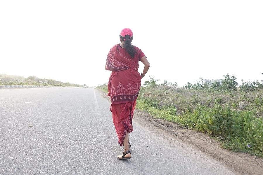 புடவை கட்டிக் கொண்டு நடப்பதே பெரிய விஷயம் இதில் ஓடுவது எப்படி என்று நினைக்க வேண்டாம். மனம் இருந்தால் மார்க்கமுண்டு. புடவை கட்டறது குறைஞ்சிருச்சுன்னா ஏற்கனவே நலிவடைந்து வரும் நெசவாளர்களோட நிலைமை மேலும் மோசமாகும். கைத்தறி புடவைகளுக்கு தனி அழகும் சிறப்பும் இருக்கு. எனவே தான், இந்த மாரத்தானில் புடவையை கட்டிட்டு ஓடி அதன் மகத்துவத்தை புரிய வைக்கணும்னு முடிவு செஞ்சேன். சொல்லிட்டேனே தவிர அதை எப்படி சாத்தியப்படுத்தறதுன்னு ரொம்பவே குழப்பம். ஒவ்வொரு ஊர் ஸ்டைல்ல புடவையைக் கட்டிப் பார்த்து முயற்சி செய்தப்போ, அது செளகரியமாக இல்லை. அதுக்கப்பறம்தான் மடிசார் கட்டிக் கொள்ளலாம், ஒன்பது கஜம் உள்ள புடவை சரியாக இருக்கும் என்று முடிவு செய்தேன். நான் தற்போது ஹைதராபாத்தில் இருந்தாலும் எனக்கு சொந்த ஊர் சென்னை தான்.