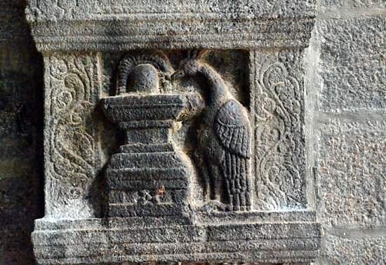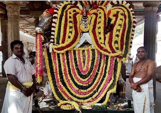 நந்தி தேவனும் அப்போது இறைவனை நோக்கி எட்டு பாடல்கள் பாடி வணங்கினார். பின்னர் நந்தி தேவன், “குருவடிவாகக் காட்சி தந்த இறைவா”, தாங்கள் இத்தலத்தில் என் மீது அமர்ந்து அனைவருக்கும் அருள்பாலிக்க வேண்டும்; நான் எப்போதும் உங்கள் அருகிலேயே இருக்க வேண்டும் எனக் கேட்டுக்கொண்டார். இறைவனும் அவ்வாறே தன் எதிரில் இருத்திக்கொண்டார். அதனால் குருபகவானின் முன் நந்தி இருப்பதை இத்தலத்தில் காணலாம்.