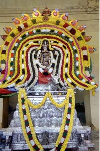 ஒரு சமயம், தர்ம தேவன் ரிஷப வாகனமாக இறைவனை சுமந்து செல்லும் பேறு பெற்றான். உலகை ஆளும் ஈசன்கூட நம்மால்தான் வேகமாகப் பல இடங்களுக்கும் செல்லமுடிகிறது என மனதில் நினைத்து கர்வமடைந்தது, அது சிவபெருமானுக்குத் தெரிந்து, தன்னுடைய சடைமுடி கற்றை ஒன்றினை ரிஷபத்தின் மேல் வைக்க, அது பாரம் தாங்காமல் மயங்கியது. பின் இறைவன் அதனை நோக்கி, உனக்கு தான் எனும் கர்வம் வந்துவிட்டது. அதனால் என்னை சுமக்கும் அருகதை உனக்கில்லை. உனது பாவம் நீங்க காவிரியில் நீராடி, வில்வ இலைகள் கொண்டு எம்மை பூஜித்தால் உனது பாவம் நீங்கப்பெற்று எம்மை வந்தடைவாய் எனக் கூறினார். நந்தியும் அவ்வாறே செய்து வர, இறைவன் அதற்கு குருவடிவாகக் காட்சி தந்து அருள் செய்தார்.