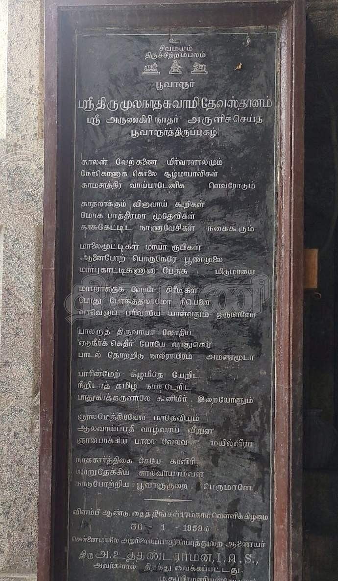 மேலும் கோயில் சன்னதி விநாயகருக்கு அருகிலேயே பூவாளூர் திருப்புகழ் குறித்த கல்வெட்டுகளும் வைக்கப்பட்டிருக்கின்றன.