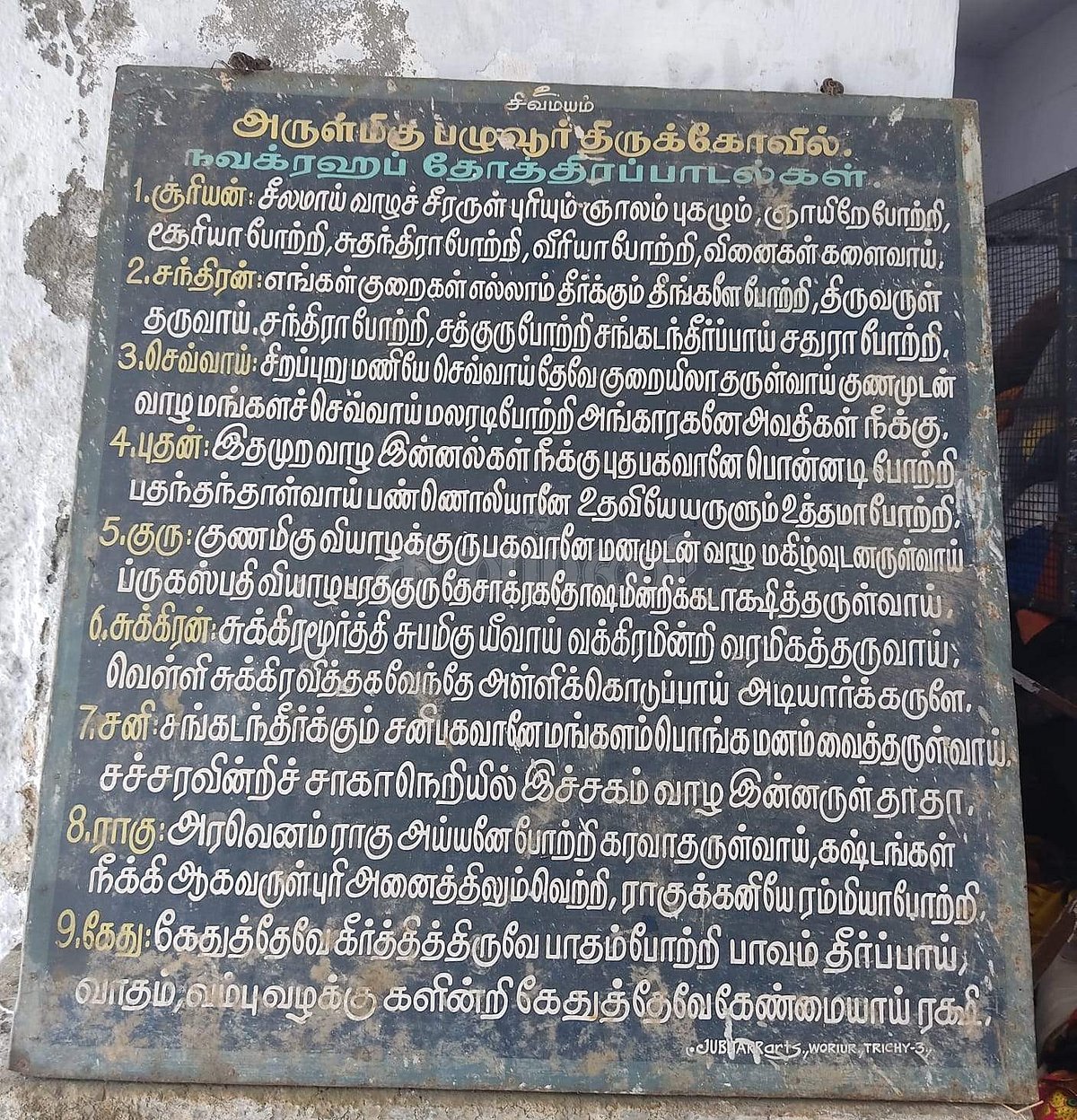 திருவக்கரையில் நவக்கிரகங்கள் ஒவ்வொன்றும் ஒவ்வொரு திசையை நோக்கி எழுந்தருளியிருக்கின்றன. பழூரில் நவக்கிரக நாயகர்கள் நவக்கிரக தோஷங்களை நீக்கும் மூர்த்திகளாகத் திகழ்கின்றனர். இங்கு நவக்கிரக நாயகர்கள் ராசி மண்டலத்துடன் தம்பதி சகிதமாக தத்தம் தேவியருடன் எழுந்தருளியிருப்பது தனி விசேஷமானதாகும்.