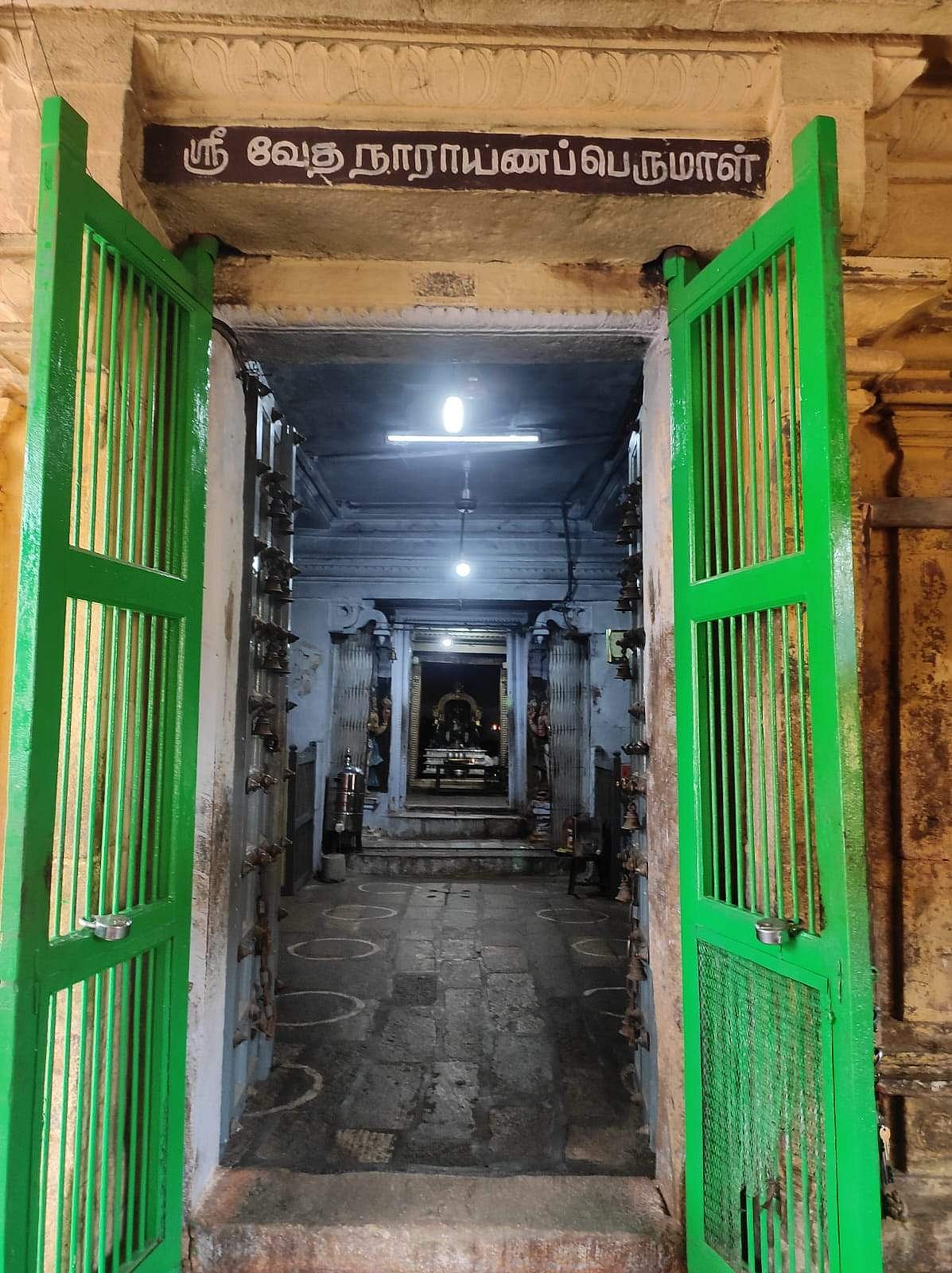 தொடர்ந்து உள் மண்டபம் வழியாக கருடாழ்வாரைத் தரிசித்தபடி உள்ளே சென்றால், கிழக்கு நோக்கிய சன்னதி கொண்டுள்ள அருள்மிகு வேதநாராயணப் பெருமாளைத் தரிசிக்கலாம். ஸ்ரீரங்கம் அரங்கநாத சுவாமி திருக்கோயிலில் பெருமாளைத் தரிசிப்பது போன்றே இங்கும் வேதநாராயணப் பெருமாள் சயனக் கோலத்தில் தரிசிக்கலாம். பெருமாள் சன்னதிக்கு அருகிலேயே வேதநாயகித் தாயார் சன்னதியும் கிழக்கு நோக்கி அமைந்துள்ளது. பெருமாள் சன்னதியில் மூலவருக்கு முன்னால் ஸ்ரீதேவி-பூதேவியுடனும், தாயார் சன்னதியில் வேதநாயகித் தாயாரும் உற்சவ மூர்த்திகளாக எழுந்தருளியுள்ளனர்.