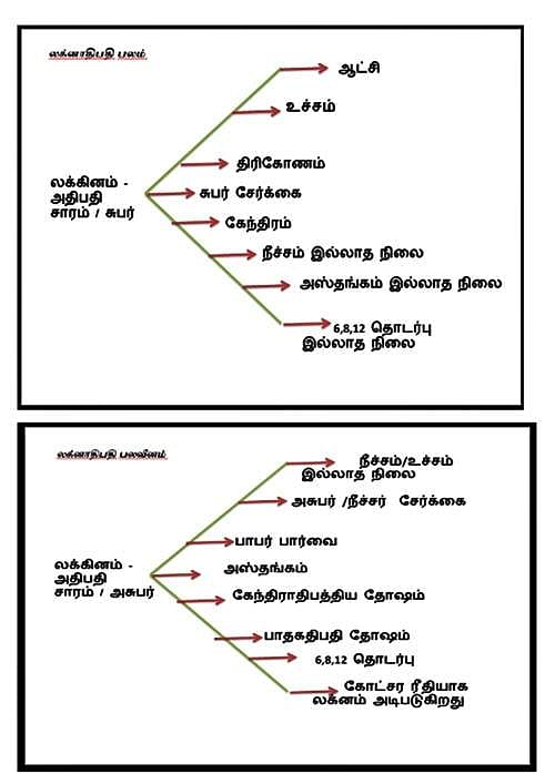 ஒரு ஜாதக கட்டத்தில் லக்கினம், ராசி அவற்றோடு அந்த சாரநாதனின் சூட்சம பலம் பலவீனம் தெரிய வேண்டும். அதன் மூலம் ஜாதகர் பற்றிய முழு விவரங்கள் அதாவது அவரவர் கௌரவம், உடலமைப்பு, நிறம், குணாதிசயங்கள், இஷ்ட தெய்வம், குலதெய்வம், ஜாதகரின் திறமை, உழைப்பு, விருப்பம் என்று பல்வேறு விஷங்களை அறிந்து கொள்ளலாம். இது தவிர ஜாதக கட்டத்தில் உள்ள பாவங்கள் மற்றும் கிரகங்களின் பலம் பலவீனம் அனைத்தும் பாவகாரகத்துவம் மற்றும் கிரக காரகத்துவம் மூலம் தெரிந்து கொள்ளலாம். சுப/அசுப பலன்களின் செயல்களை தசா புத்தி காலத்தில் செயல்படும் அதோடு கோட்சாரமும் துணை செய்யும். அடிப்படை முறையில் ஜாதகம் கணிக்க முக்கிய உயிர் நாடியான லக்கினம் பலம் மற்றும் பலவீனம் காணக் கீழே உள்ள வரைபட குறிப்பு போதுமானது.