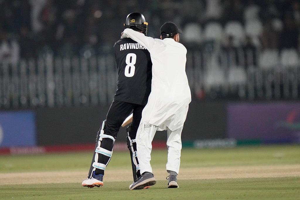 நேற்று (பிப்.24) நியூசிலாந்து, வங்கதேசம் விளையாடிய போட்டியில் ரசிகர் ஒருவர் நியூசி. வீரர் ரச்சின் ரவீந்திராவை கட்டியணைத்தார்.