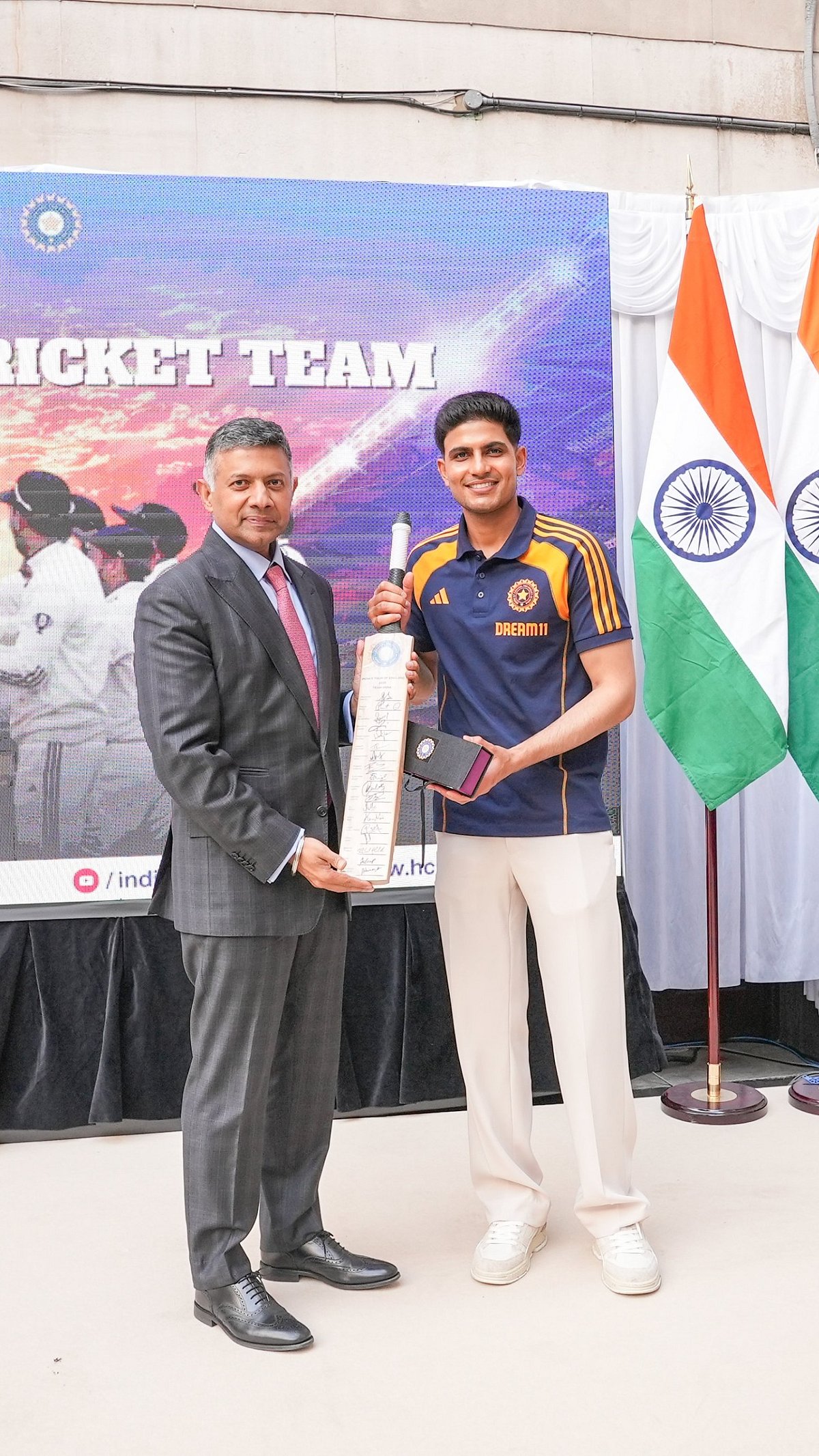 வீரர்கள் கையொப்பமிட்ட பேட்டை தூதரக அதிகாரிக்கு பரிசளித்த இந்திய அணி கேப்டன் ஷுப்மன் கில்.