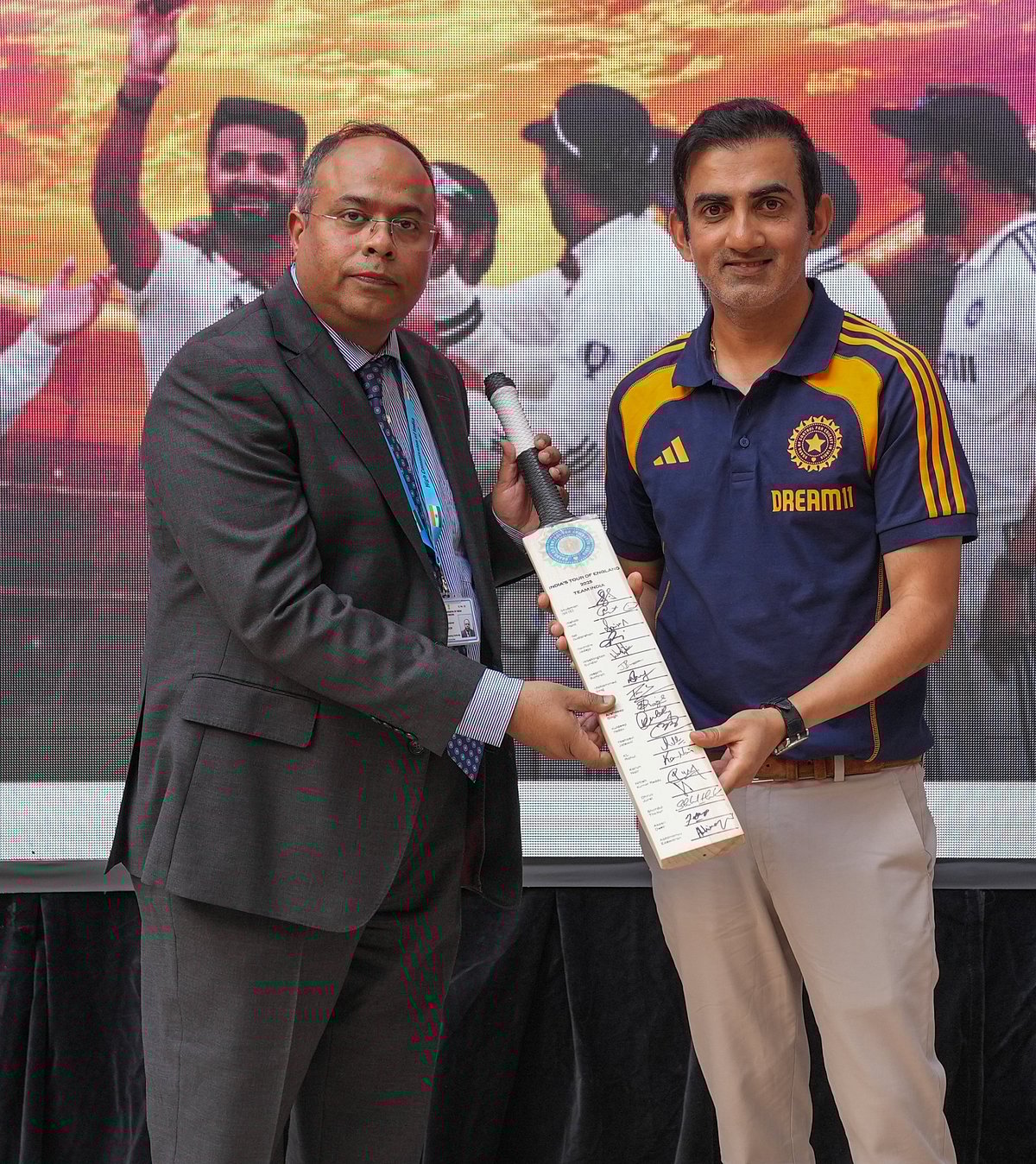 அவர்களுக்கு வீரர்கள் கையொப்பமிட்ட பேட்டை இந்திய அணி கேப்டன் ஷுப்மன் கில் மற்றும் பயிற்சியாளர் கௌதம் கம்பீர் இருவரும் பரிசளித்தனர். அப்போது அவர்கள் குழுவாகப் புகைப்படமும் எடுத்துக் கொண்டனர்.