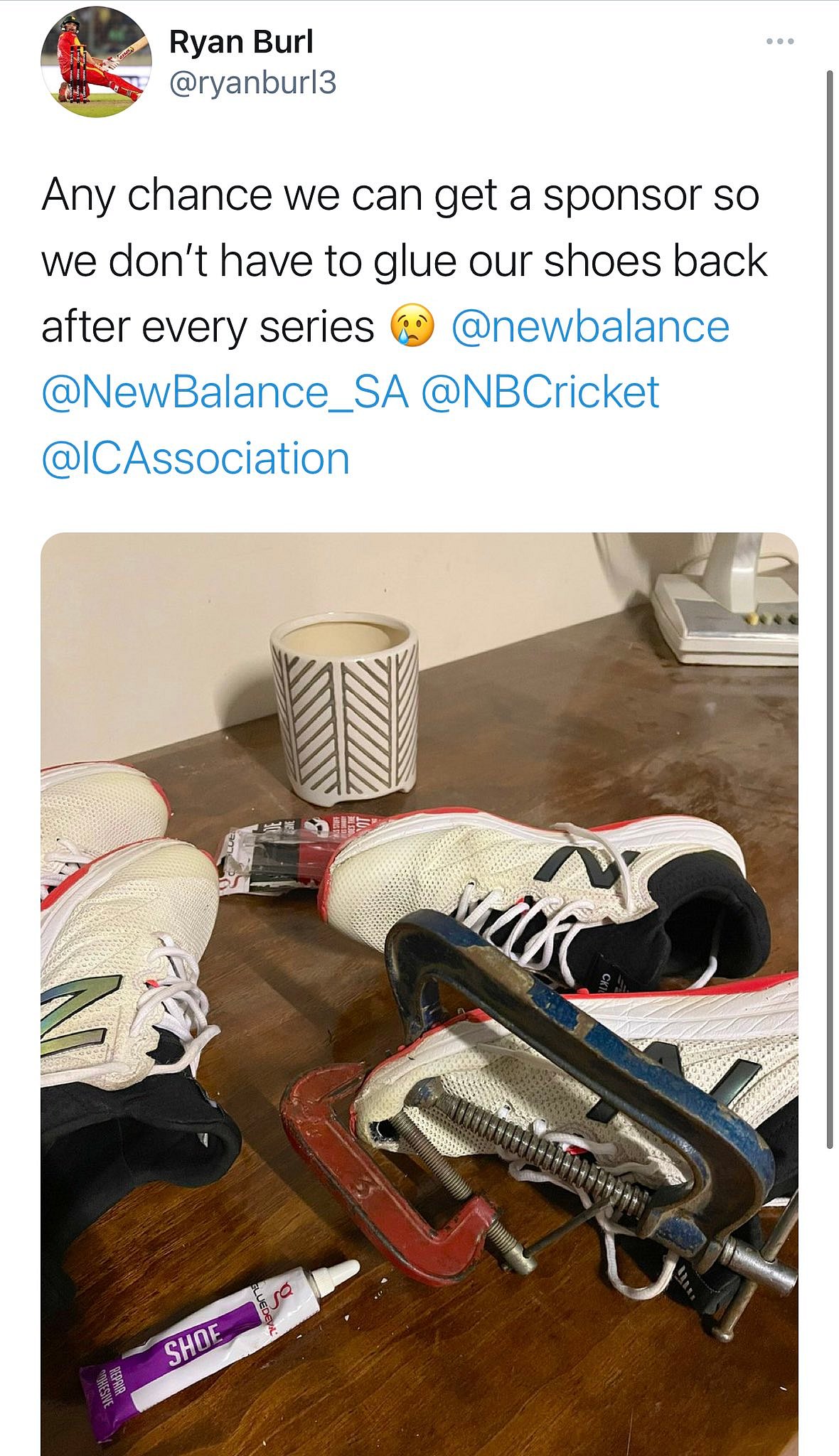 அந்தப் பதிவில், “எங்களுக்கு ஒரு ஸ்பான்ஸர் கிடைத்தால், ஒவ்வொரு போட்டித் தொடருக்குப் பின்னரும் எங்களின் கிழிந்த காலணிகளை ஒட்டுப்போட வேண்டிய தேவை இருக்காது” எனப் பதிவிட்டிருந்தார்.