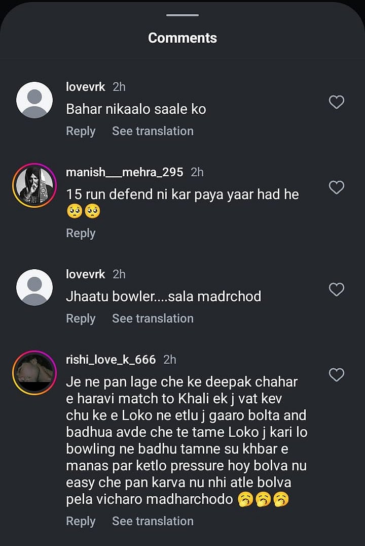 இந்தத் தோல்விக்கு மும்பை இந்தியன்ஸ் ரசிகர்கள் தீபக் சஹாரின் இன்ஸ்டா பக்கத்தில் மிகவும் ஆபசமாக கமெண்ட் செய்து வருகிறார்கள்.