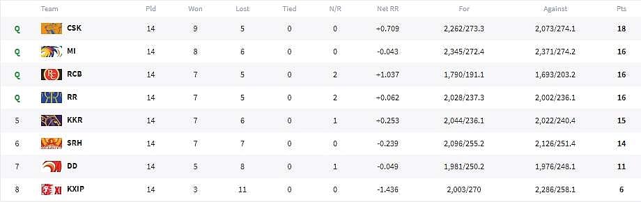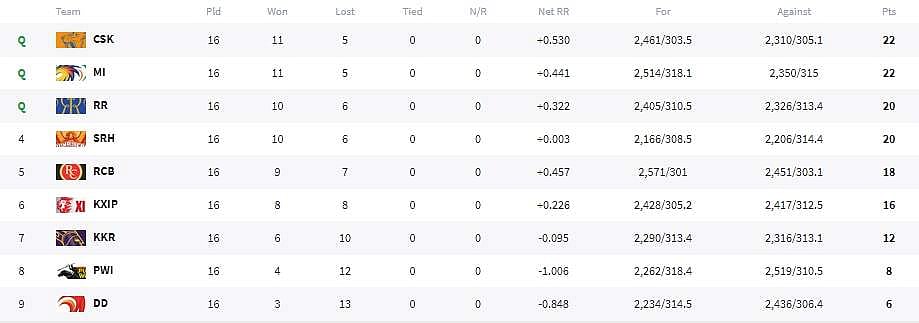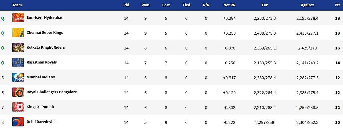 பிளே ஆஃப்-பில் பங்கேற்ற அணிகள்: (வரிசைப்படி) சென்னை, மும்பை, ராஜஸ்தான், ஹைதராபாத்
