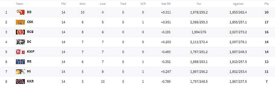 கடைசி இரு இடங்கள்: ராஜஸ்தான், பஞ்சாப் (கடைசி இடம்).