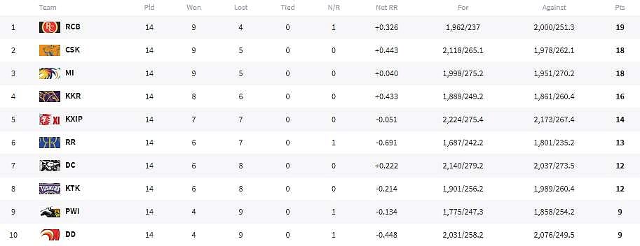 பிளே ஆஃப்-பில் பங்கேற்ற அணிகள்: (வரிசைப்படி) சென்னை, மும்பை, பெங்களூர், ராஜஸ்தான்