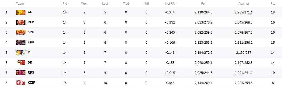 பிளே ஆஃப்-பில் பங்கேற்ற அணிகள்: (வரிசைப்படி) தில்லி, சென்னை, பெங்களூர், ஹைதராபாத்