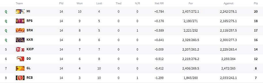 பிளே ஆஃப்-பில் பங்கேற்ற அணிகள்: (வரிசைப்படி) மும்பை, ஹைதராபாத், சென்னை, பெங்களூர்