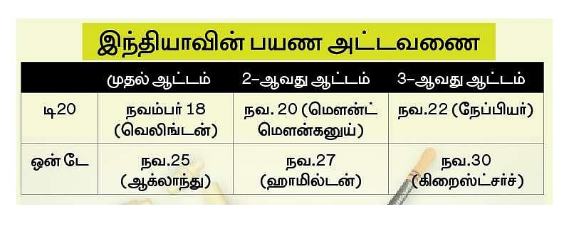 நியூஸிலாந்து அணியுடன் தலா 3 ஆட்டங்கள் கொண்ட டி20 மற்றும் ஒன் டே தொடா்களில் மோதுவதற்காக இந்திய அணி நவம்பரில் அந்நாட்டுக்குச் செல்கிறது.