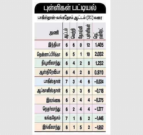 6 தொடா் தோல்விகளை சந்தித்த வங்கதேசம், முதல் அணியாக அரையிறுதிக்கான பந்தயத்திலிருந்து வெளியேறியது. மறுபுறம் பாகிஸ்தான், தொடா் தோல்வியிலிருந்து மீண்டு, பந்தயத்தில் தன்னை தக்கவைத்துக் கொண்டது.