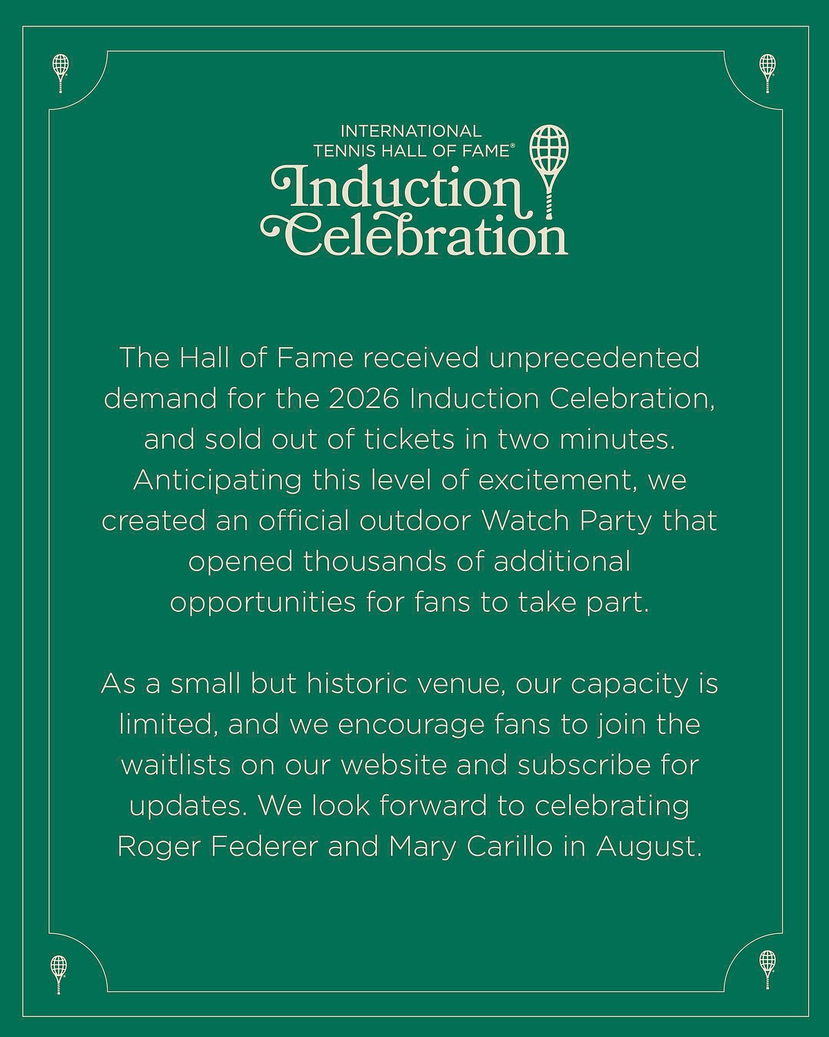 ‘ஹால் ஆஃப் பேம்’ டென்னிஸ் போட்டிக்கான டிக்கெட்டுகள் 120 வினாடிகளில் விற்றுத்தீர்ந்ததைப் பற்றி...