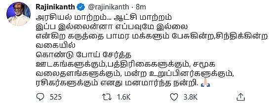 அரசியல் மாற்றம் தொடர்பாக பத்திரிகையாளர்கள் சந்திப்பில் நான் கூறிய கருத்தை மக்களிடம் கொண்டு சேர்த்த ஊடகங்களுக்கு நடிகர் ரஜினிகாந்த் நன்றி தெரிவித்துள்ளார்.