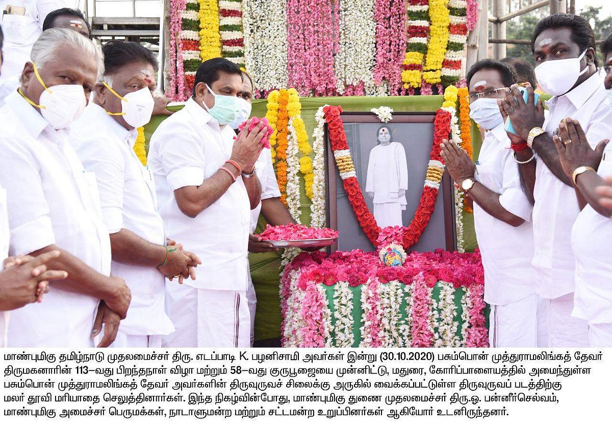 தேவர் ஜயந்தியை முன்னிட்டு மதுரை கோரிப்பாளையத்தில் உள்ள முத்துராமலிங்கத் தேவர் சிலைக்கு முதல்வர் எடப்பாடி பழனிசாமி மாலை அணிவித்து மரியாதை செலுத்தினார்.