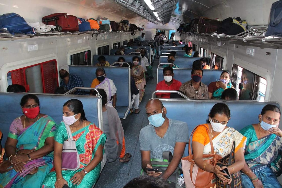சமூக இடைவெளி இன்றி ரயில்பெட்டி இருக்கையில் அமர்ந்து செல்லும் பயணிகள்.இடம் சேலம் ஜங்ஷன் ரயில் நிலையம்.