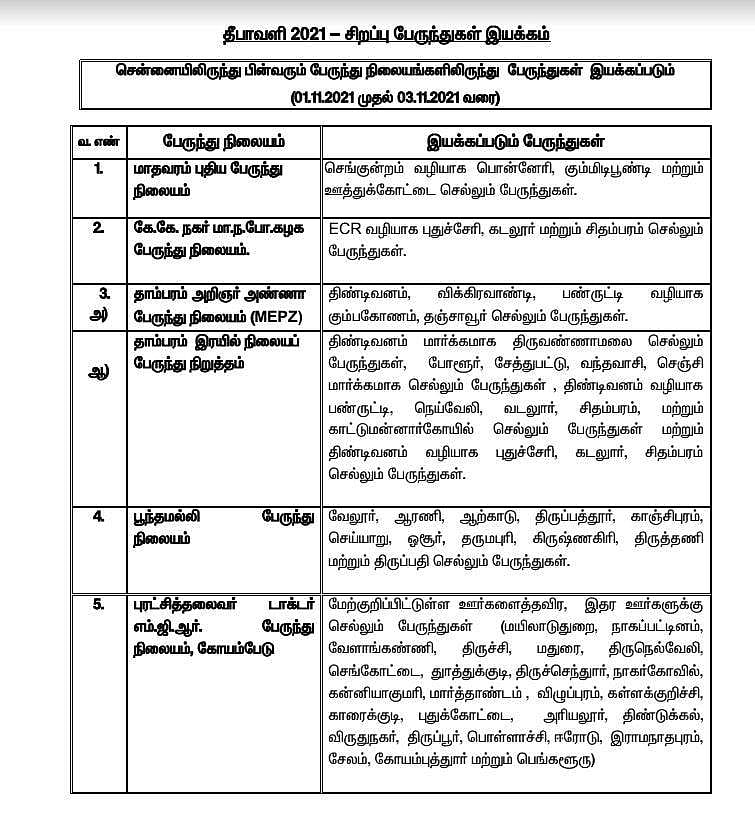 05/11/2021 முதல் 08/11/2021 வரையில், தினசரி இயக்கக் கூடிய 2,100 பேருந்துகளுடன், 4,319 சிறப்புப் பேருந்துகளும், ஏனைய பிற முக்கிய ஊர்களிலிருந்து பல்வேறு ஊர்களுக்கு 5,000 சிறப்பு பேருந்துகள் என மொத்தமாக 17,719 பேருந்துகளும் இயக்கப்படுகின்றன.”