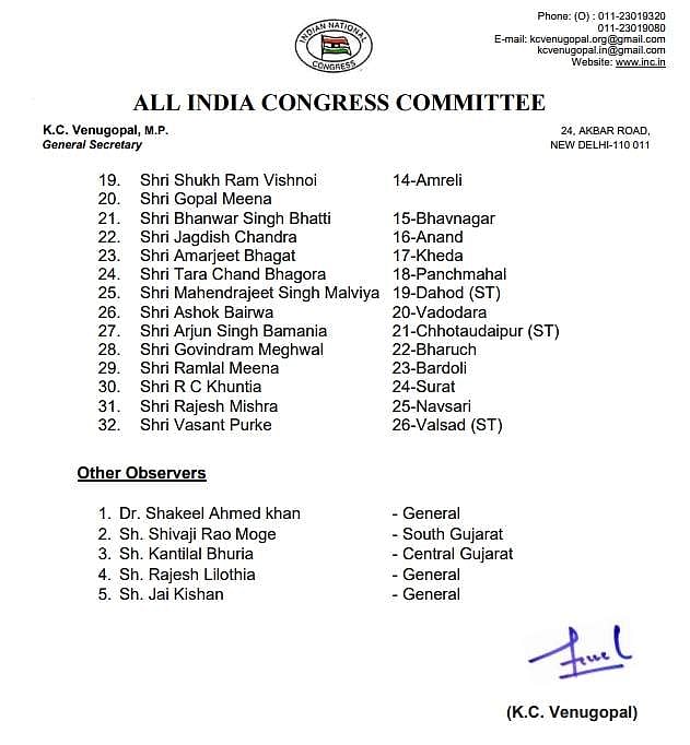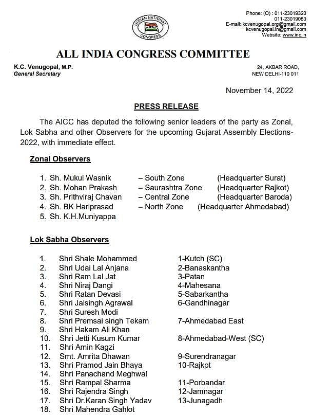 குஜராத் தேர்தலுக்கான தேர்தல் பார்வையாளர்கள் பட்டியலை காங்கிரஸ் வெளியிட்டுள்ளது.