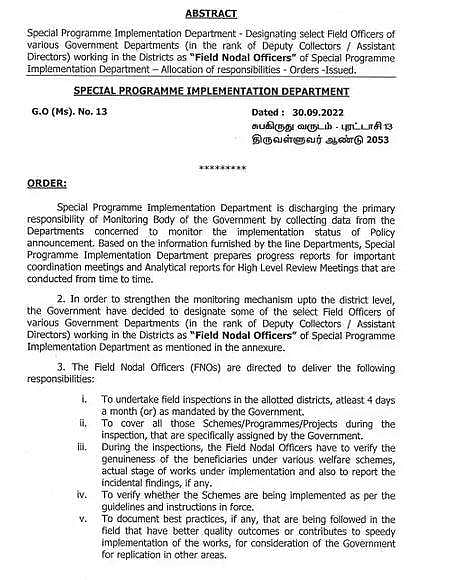 சிறப்பு திட்ட செயலாக்கத் துறையின் திட்டங்களின் நிலை குறித்து கண்காணிக்க சிறப்பு அதிகாரிகளை தமிழக அரசு அரசாணை வெளியிட்டுள்ளது.
