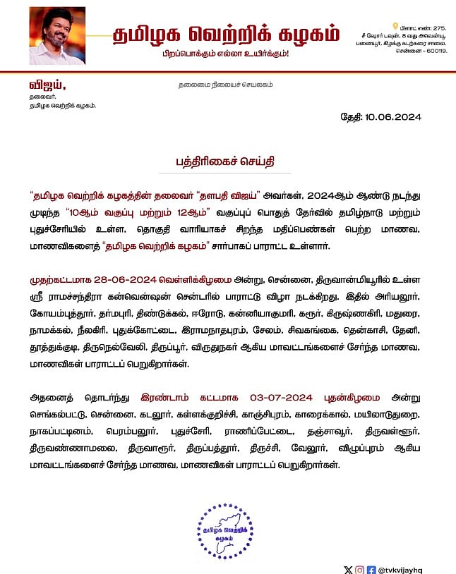 கடந்த ஆண்டு 10 மற்றும் 12- ஆம் வகுப்பு பொதுத் தோ்வில் தமிழகம் முழுவதும் தொகுதி வாரியாக சிறப்பிடங்களைப் பெற்ற மாணவ, மாணவிகளுக்கு ஊக்கத் தொகை மற்றும் சான்றிதழ்களை நடிகர் விஜய் வழங்கினார்.