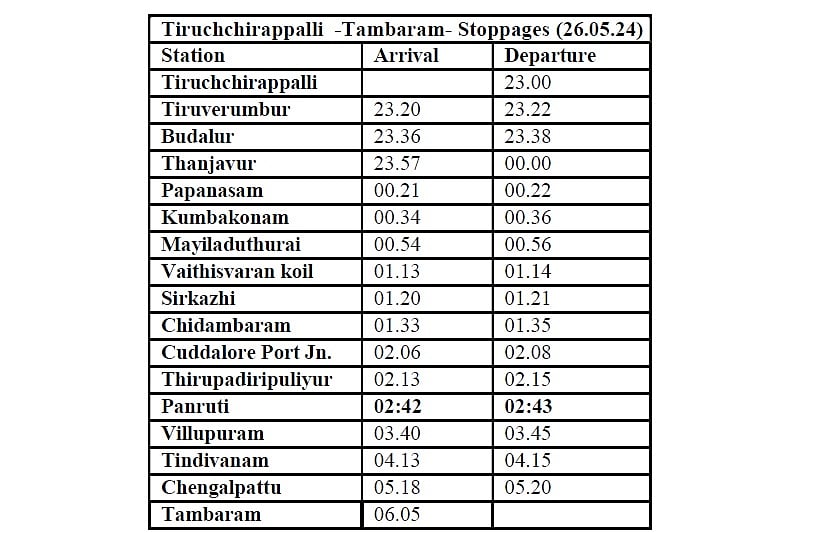 முன்பதிவில்லாத இந்த ரயில் இடையில் திருவெறும்பூர், பூதலூர், தஞ்சாவூர், பாபநாசம், கும்பகோணம், மயிலாடுதுறை, வைத்தீஸ்வரன் கோயில், சீர்காழி, சிதம்பரம், கடலூர் துறைமுக சந்திப்பு, திருப்பாதிரிப்புலியூர், பண்ருட்டி, விழுப்புரம், திண்டிவனம், செங்கல்பட்டு ஆகிய ரயில் நிலையங்களில் நின்று செல்லும் எனத் தெரிவிக்கப்பட்டுள்ளது.