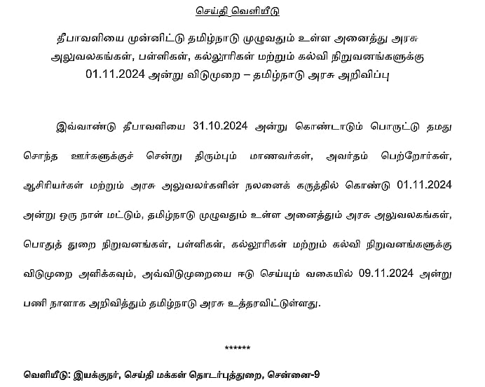 அரசு அலுவலகங்கள், பொதுத் துறை நிறுவனங்கள், பள்ளி, கல்லூரிகளுக்கு நவம்பர் 1ஆம் தேதி வெள்ளிக்கிழமையும் விடுமுறை அறிவிக்கப்பட்டுள்ளது.
