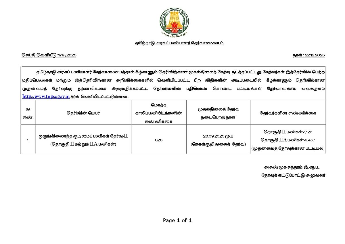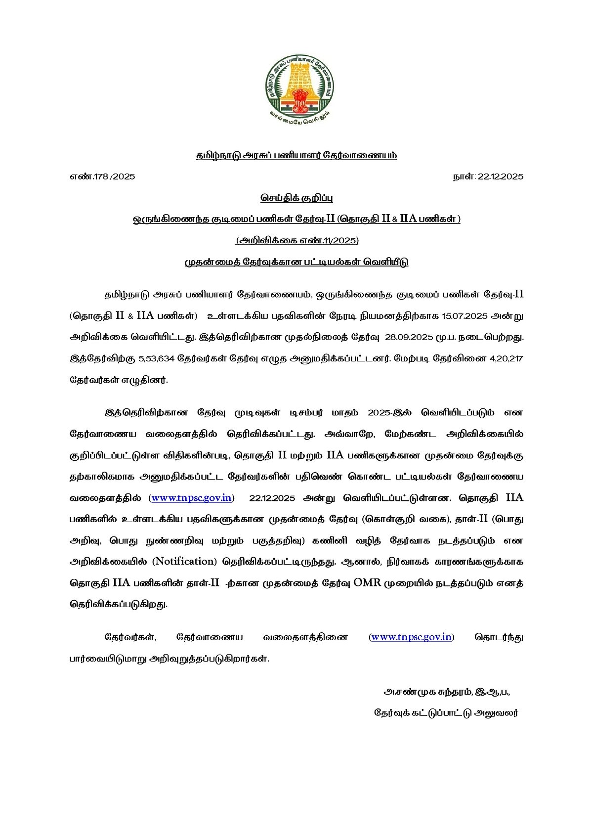 ”தமிழ்நாடு அரசுப் பணியாளர் தேர்வாணையம், ஒருங்கிணைந்த குடிமைப் பணிகள் தேர்வு-II (தொகுதி II & IIA பணிகள்) உள்ளடக்கிய பதவிகளின் நேரடி நியமனத்திற்காக 15.07.2025 அன்று அறிவிக்கை வெளியிட்டது. இத்தேர்வுக்கான முதல்நிலைத் தேர்வு 28.09.2025 நடைபெற்றது. இத்தேர்விற்கு 5,53,634 தேர்வர்கள் தேர்வு எழுத அனுமதிக்கப்பட்டனர். மேற்படி தேர்வினை 4,20,217 தேர்வர்கள் எழுதினர்.